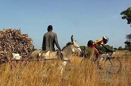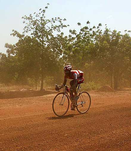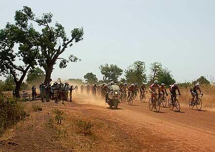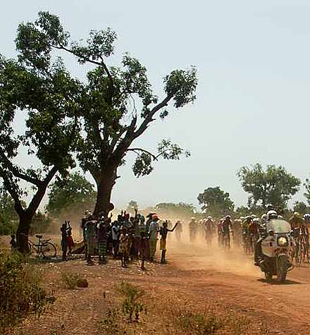 ........................................ Bienvenue au plat pays ! ........................................ « Aujourd’hui, les héros du Tour du Faso s’attaquent à une étape historique. Pour la première fois, nous allons visiter la région de Gaoua, pour une étape de costauds où les meilleurs se révèleront sur les routes vallonées du sud-ouest du pays, et où les autres risquent déjà de tout perdre. C’est à la fois les Pyrénées et les Alpes du Burkina ! », s’enthousiasmait l’incomparable speaker Sofiane Coulibaly au départ de la 2ème étape. Légèrement porté sur l’emphase, le plus marseillais des Burkinabè présentait une des nouveautés 2005. Jamais le Tour n’avait pu explorer ces régions proches du Ghana et de la Côte d’Ivoire, réputées pour être plus vallonnées que le reste du pays. La récente réfection de la route a permis cette année aux organisateurs de mettre au programme cette succession de casse-pattes : « Mais attention, il ne s’agit quand même pas d’ascensions classées, où alors il faudrait inventer de nouvelles catégories », avait prévenu Laurent Bezault, le directeur sportif de l’épreuve. Et en effet, les pentes avalées par le peloton du Tour du Faso n’ont pas grand chose à voir avec les cols du Galibier ou de la Madeleine. En réalité, c’est plutôt sur un enchaînement de faux-plats montants que les coureurs se sont esquintés les guiboles.