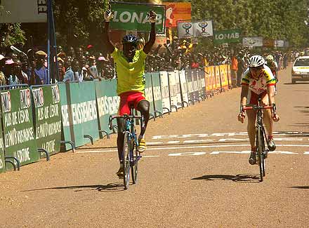 Les trois premiers dans la même seconde au général ! ... Mais l’attaquant le plus rapide de l’ouest africain est une fois encore rattrapé par son destin. S’il a encore 24’’ d’avance sur un groupe de 4 contre-attaquants à 5 km de la ligne, et 43’’ sur le peloton, il est repris dans le dernier kilomètre, où se prépare un sprint entre spécialistes. Celui que l’on surnomme déjà l’ogre du cyclisme burkinabè, Jérémie Ouedraogo, règle ses rivaux sur la ligne et s’empare du maillot jaune. Le nouveau porte-drapeau du Burkina est départagé, à l’addition des places depuis le début de l’épreuve, de Saïdou Rouamba et de Martinien Tega, tous trois dans la même seconde.