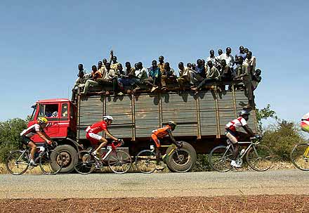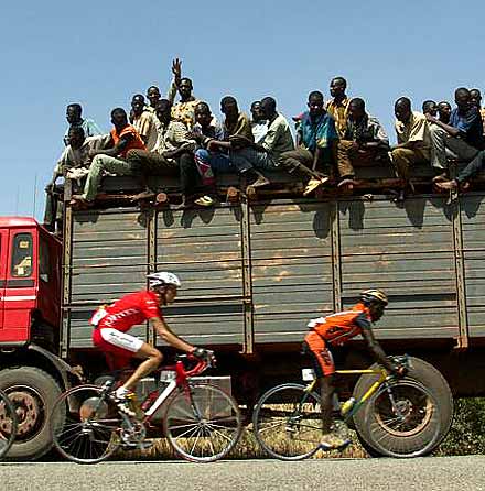 ............................................. Revenus pour gagner ............................................. L’équipe cycliste du Cameroun est décidément bien plus rapide à vélo qu’en avion. L’édition 2004 du Tour du Faso avait dû se passer de la présence des Lions à cause d’un problème de vol qui les avait retenu loin de Ouagadougou. Cette année, leur périple aérien leur a finalement permis d’arriver à l’heure à la cérémonie de présentation des équipes, mais l’effort aura été conséquent. Jugez plutôt : « En deux jours, nous sommes allés de Douala à Nairobi, puis à Dakar, Bobo-Dioulasso et enfin Ouaga », détaillait l’entraîneur national Charles Bana en espérant que ses coureurs ne payeraient pas trop cher la fatigue accumulée dans le ciel et les salles d’embarquement.