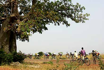 Tout le monde en veut ... Avec un programme aussi court, il était attendu que les attaquants ne se feraient pas désirer longtemps. C’est un duo nippo-sénégalais qui lance la première offensive au km 2, rapidement réprimée par un peloton mené par les Burkinabè. Une brochette de neuf coureurs, encore à dominante sénégalaise, mais où s’est également incrusté l’inusable Gunter Cuylits (BEL), se forme en deux temps et prend 15’’ d’avance au km 12. Au km 18, il ne sont plus que six, et leur pécule de secondes diminue dangereusement : un kilomètre plus loin, il réintègrent le peloton.