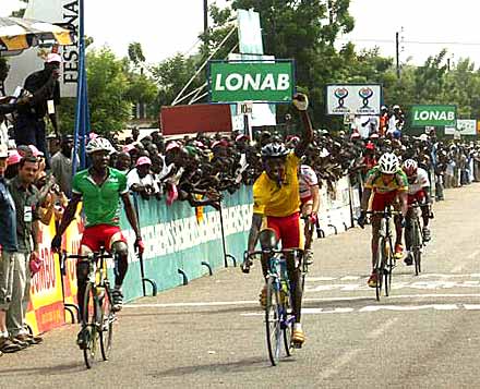 Le duel Ouedraogo-Rouamba ... Le groupe est assez rigoureux et efficace pour prendre rapidement une trentaine de secondes d’avance et se présenter au deuxième sprint du jour avec cet avantage. Ouedraogo y passe en tête devant Rouamba et Keita. A douze kilomètres de l’arrivée, tous les membres de cette échappée ont intérêt à poursuivre leur effort. C’est un sprint entre l’élite ressérée du Tour qui se prépare à Koupela. On attend la confrontation entre Rouamba, le capitaine historique des Etalons et Ouedraogo, le champion national en titre. Encore une fois, l’élève dépasse le maître.