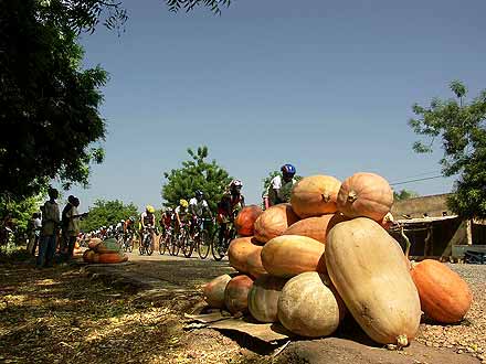 Crevaison pour le maillot jaune ... Le programme est chargé, et tout le monde a déjà beaucoup souffert la veille, en route vers Ouahigouya. Et il n’est dans l’intérêt de personne de faire exploser rapidement le peloton, les soldats burkinabè ayant suffisament contribué à soigner la moyenne kilométrique tous les jours. Un groupe de dix coureurs se dégage peu avant le 10ème kilomètre, mais Jérémie Ouedraogo, victime de crevaison, n’a pu attraper le wagon. L’échappée prend tout de même 1’05’’ d’avance sur le peloton au km 16, mais cesse d’exister avant le sprint intermédiaire de Yako