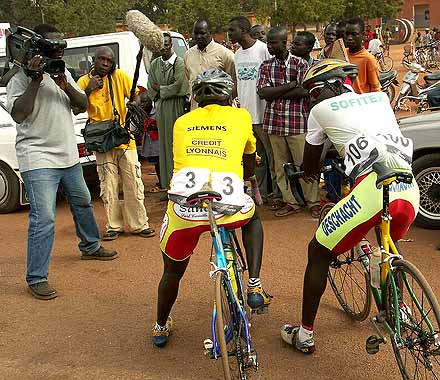 ........................................... Quand le Tour regarde le Tour ........................................... Sur le continent africain, le Tour de France est en partie responsable de l’attrait grandissant pour le cyclisme. Dans beaucoup de pays, et spécialement dans ceux représentés sur le Tour du Faso, les après-midi de juillet sont elles aussi rythmées par les retransmissions de la Grande Boucle, assurées en direct et en intégralité par TV5 Afrique. Il se trouve qu’entre amateurs de cyclistes de tous pays et d’univers (pas tant que ça !) opposés, les discussions de bivouac tournent souvent autour de cette course de référence. Et l’avis des plus fortement atteints par la passion du vélo en Afrique, c’est-à-dire les coureurs du peloton eux-mêmes, ne manque pas d’enseignements.