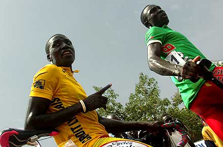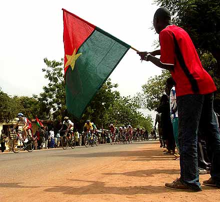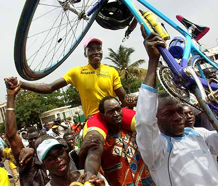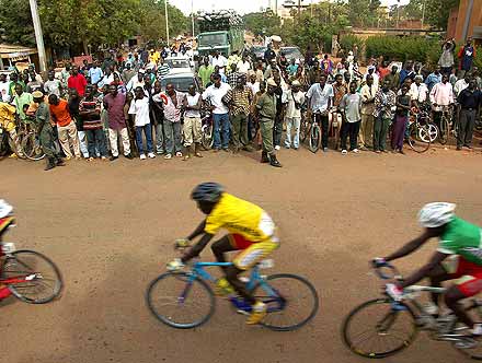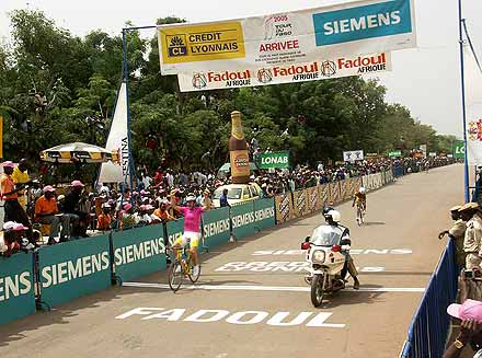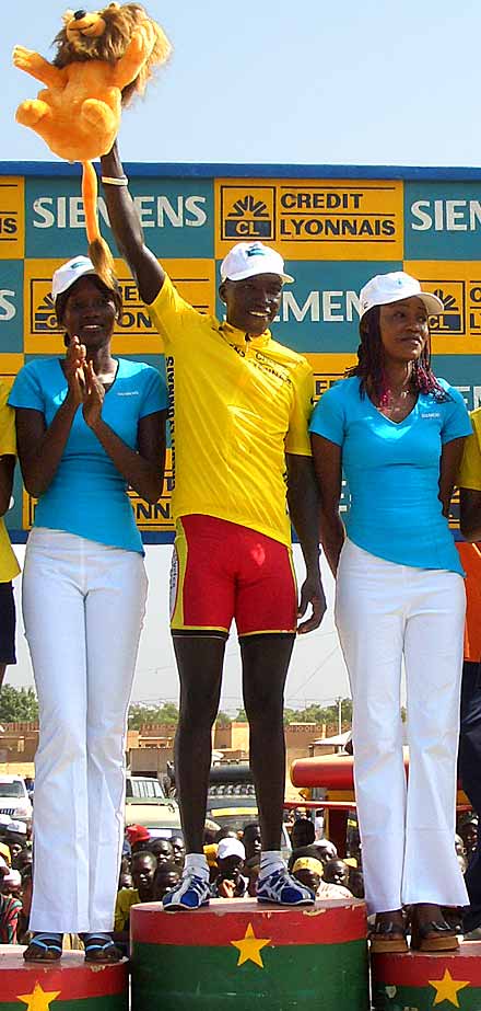 Voir ici —> Le Classement Final complet du 19ème Tour du Faso 2005 ............................... Cyclisme à l’africaine, cyclisme à l’ancienne ............................... Jérémie Ouedraogo a le triomphe modeste. Devant le palais présidentiel de Ouaga, il vient d’accomplir un rêve d’enfant, remporter le plus grand tour cycliste d’Afrique. Porté par ses supporters, dont certains, par tradition, lui remettent symboliquement de l’argent en témoignage de leur joie, il offre un sourire à peine plus large que les jours précédents. A la descente des épaules, ses premiers mots vont, comme à chaque fin d’étape, à l’ensemble de ses coéquipiers, « qui ont accompli un travail formidable pour m’aider à conserver le maillot jaune. Sans eux je ne suis rien, pendant les étapes difficiles ils ont maintenu un train d’enfer en tête de course pour empêcher les attaques. Je leur dois tout cela ». Le discours, un peu timide, peut sembler convenu. Il n’en est rien.