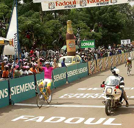Deux hommes s’échappent ... A l’entrée dans la capitale, alors que quelques courageux ont changé d’avis et sont partis à la chasse au groupe de tête, l’élite a 1’15’’ d’avance sur le gros du peloton. Mais peu avant l’entrée dans le circuit final, le maillot rose Marien et le Camerounais Teguimaha, momentanément rejoints par Olivier Keita (SEN), faussent compagnie au peloton maillot jaune où toute la vigilance est retenue par le cas de Karel Pattyn.