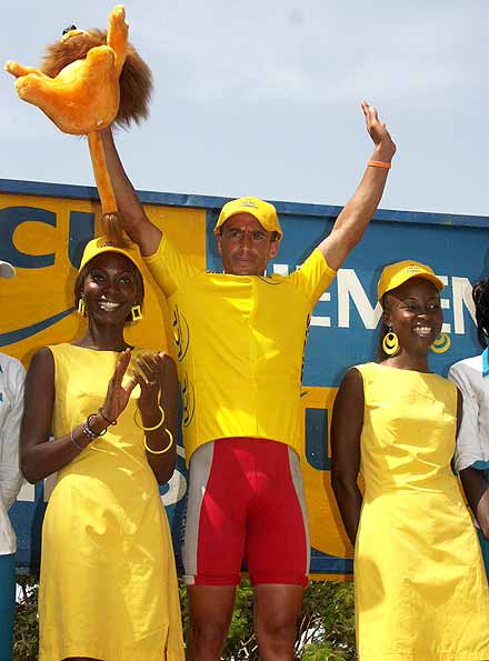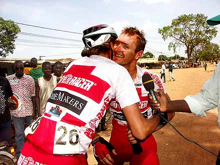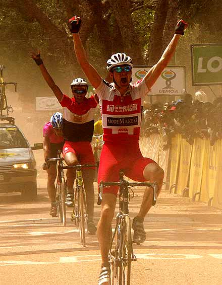 Verdonck, le plus frais ... - Le duo revient rapidement sur l’homme de tête, un final à trois se prépare. Encore une fois malchanceux, le maillot rose crève quasiment en vue de la ligne, il laisse donc Abdulah et Verdonck se disputer la victoire d’étape. Le Belge, plus puissant, s’impose pour la deuxième fois à Ziniaré et s’empare du même coup du maillot vert, perdu sur un nouveau coup de déveine par Lionel Syne, qui a lui aussi percé dans le final. C’était sa troisième crevaison du jour !