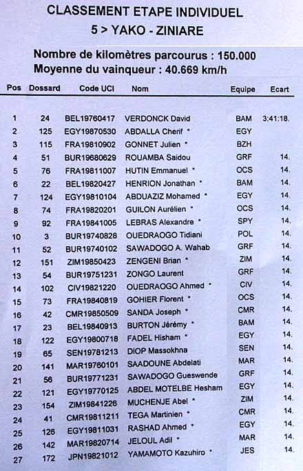 Verdonck, l’enfant du pays - Après les réprimandes d’usage des Marocains, qui ont fait comprendre à tous les éventuels rivaux de Saadoune qu’une échappé au long cours leur était interdite, un groupe cohérent a longtemps semblé en mesure de parvenir au but. Mais parmi les neuf coureurs en question, seul Charif Abdulah (Egy) était encore à la lutte sur la ligne d’arrivée. David Verdonck (Bel), plus frais et performant dans le final, efface la déception de sa deuxième place de la veille et remporte sa deuxième victoire à Ziniaré, où il s’était déjà imposé en 2005. Il se positionne par ailleurs au quatrième rang du classement général à mi-course, à 26 secondes de Saadoune.