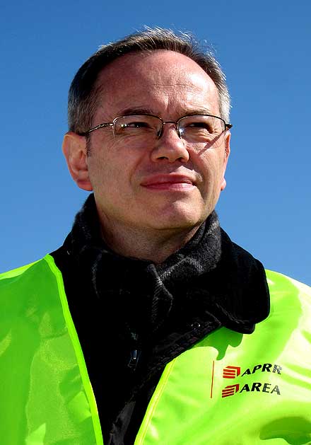 En photo ci-dessus, Pascal Devertu, directeur de la communication d’A.P.R.R. (Autoroute Paris Rhin Rhône) Quatrième groupe autoroutier en Europe, le groupe Autoroutes Paris-Rhin-Rhône (APRR et AREA), filiale d’Eiffage, exploite un réseau de 2 205 km d’autoroutes sur les 2 279 qui lui sont concédés par l’État. Le réseau exploité comprend notamment l’axe Paris-Lyon (A5, A6, A39), un axe Bourgogne-Europe du Nord (A31, A36), des autoroutes alpines dans la région Rhône-Alpes (A40, A41, A42, A43, A48, A49, A51 Nord) et des autoroutes au Centre de la France (A77, A71). Axe de communication majeur en Europe, ce réseau a enregistré plus de 20 milliards de kilomètres parcourus en 2005. Le chiffre d’affaires consolidé du Groupe a atteint 1 571 millions d’euros en 2005 pour un résultat net de 195 millions d’euros. Le Groupe emploie près de 4 400 personnes.