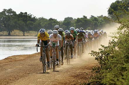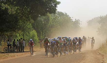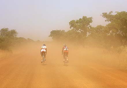 Kagambega montre l’exemple ... A en juger par le rythme élevé auquel les coureurs débutent l’étape en sortant de Boromo, on imagine qu’ils sont pressés d’en découdre sur la latérite qui les attend pour le dessert. Ce n’est qu’au km 11 qu’un premier groupe parvient à se détacher à l’initiative de Kagambega (Bur), avec Karraz (Mar), Nikiema (Bur), Burton (Bel), Brandt (Fra - ALS), Nijmeijer (Hol) et Nari (Fra - ESS). Leurs efforts sont toutefois anéantis cinq kilomètres plus loin.