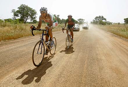 Er Ragragui dans la roue de Smet ... La tentative suivante, qui semble bien lointaine au regard du programme à venir, prend plus facilement ses distances avec le peloton. Er Ragragui (Mar) et Smet (Bel), passent sur le sprint intermédiaire de Tita (km 53) avec une marge de 1’20’’, alors que le Marocain se contente de rester dans la roue de son « partenaire », mieux classé que lui au général. La cadence entretenue par le rouleur belge permet au duo d’accroître son avance sur le peloton et de se préserver du retour d’un trio de contre-attaquants, composé de Tall, Compaoré (Bur) et Touré (Civ). Après 75 km de course, le peloton pointe avec 3’50’’ de retard sur les hommes de tête.