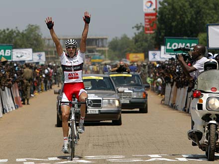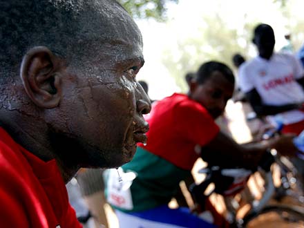 Une garde robe complète pour Smet ... Conscient que le nombre de candidats commence à menacer ses chances, Guy Smet choisit au km 91 l’option « solo », qui correspond le mieux à son registre. C’est sur sa puissance que le Belge a remporté 37 courses dans son pays depuis le début de la saison. Une fois l’attaque portée, ses anciens compagnons d’échappée subissent immédiatement la situation. Seuls Téguimaha et Leraud, qui n’ont pas été affranchis sur le potentiel du Flamand, continuent à distance d’y croire (55’’ de retard à 15 km de l’arrivée). Adepte des longues lignes droites et des gros braquets, Smet poursuit sa route vers Boromo sans se retourner. Les coureurs burkinabè, inquiets de laisser un capital trop important (2’40’’ à 20 km de l’arrivée), se consacrent à la fin de l’étape à la réduction de l’écart. A l’arrivée, Smet endosse les maillots jaune, rose et vert. La panoplie est complète.