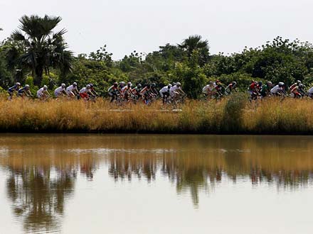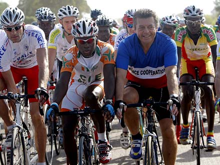 Trois ministres en selle ... Pour donner symboliquement le coup d’envoi de la 22ème édition du Tour du Faso, le Ministre français de la coopération et de la francophonie, Alain Joyandet, a convié Jean-Pierre Palm, Ministre des sports et des loisirs, et Aminata Samaté, Ministre déléguée en charge de la coopération, à prendre place au cœur du peloton. Honnête amateur de cyclisme, Alain Joyandet résiste plus longtemps que ses homologues du gouvernement burkinabè, mais cède au rythme déjà élevé des coureurs dans le quatrième kilomètre de course. La performance est toutefois plus notable que celle des Maliens, dont le faux-bond collectif réduit le nombre d’équipes à 14, soit 82 coureurs engagés.
