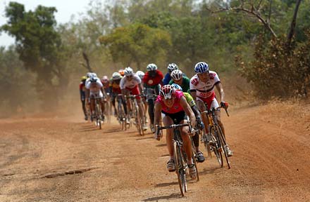 Teguimaha à l’action ... Les Camerounais ont prouvé à Houndé qu’ils avaient les moyens de tenir la comparaison avec les coureurs européens. Il leur reste maintenant à se lancer à la conquête du Maillot Jaune, et programme de l’étape du jour correspond tout à fait à cette ambition. Sadrak Teguimaha (Cam) ne fait d’ailleurs pas mystère de ses intentions. Il prend place dans un groupe de 14 coureurs formé au km 4. Avec Martinien Tega (Cam) et Laurent Donnay (Bel), ce sont trois coureurs du Top 10 qui se sont glissés dans le groupe. La blague n’est pas du goût des coureurs du Team Reine Blanche, qui n’ont pas réussi à sauter dans ce train. Ce sont eux qui organisent le retour du peloton, effectif au km 33.